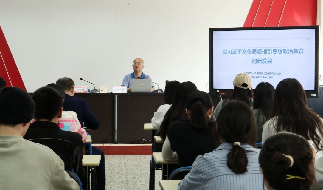 师生开展学术交流。他在报告中阐述了习近平文化思想的价值意蕴,从思想政治教育的培养定位、本质追溯、价值引领三个方面阐释了“时代新人”是党的教育方针的时代表达,详细讲述了思想政治教育的发展趋势和时代特质。