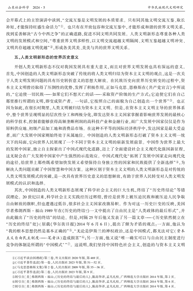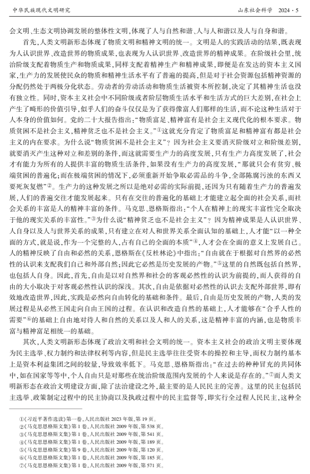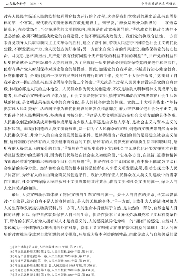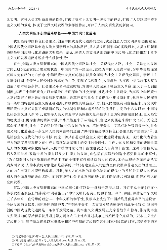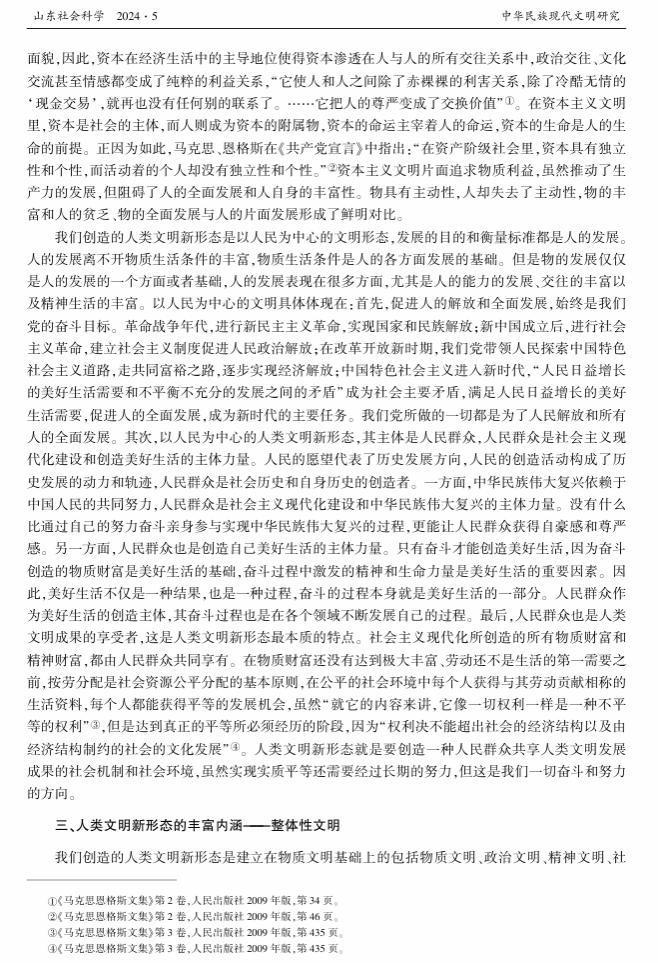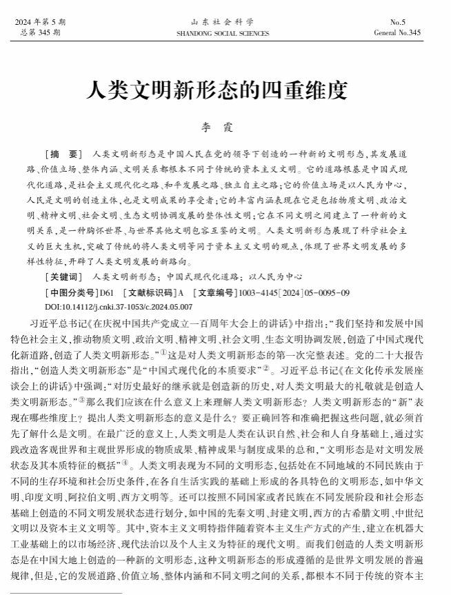 李霞教授的学术论文《人类文明新形态的四重维度》在《山东社会科学》(2024年第5期)发表,并被《中国社会科学文摘》(2024年第9期)观点摘登。 论文指出:人类文明新形态是中华民族在党的领导下创造的一种新的文明形态,其发展道路、价值立场、整体内涵、文明关系都不同于资本主义文明。其道路根基是中国式现代化道路,是社会主义现代化之路、和平发展之路、独立自主之路;其价值立场是以人民为中心,人民是文明的创造主体,也是文明成果的享受者;其丰富内涵表现在它是包括物质文明、政治文明、精神文明、社会文明、生态文明协调发展的整体性文明;它在不同文明之间建立了一种新型的文明关系,是一种胸怀世界、与世界其他文明包容互鉴的文明。人类文明新形态展现了科学社会主义的巨大生机,突破了将人类文明等同于资本主义文明的传统观点,体现了世界文明发展的多样性特征,开辟了人类文明发展的新路向。