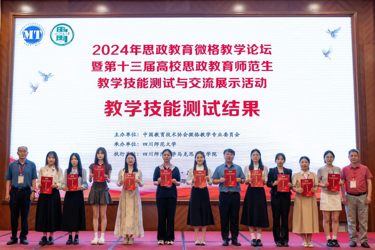 2024年5月24日—5月27日,2024年思政教育微格教学论坛暨第十三届高校思政教育师范生教学技能测试与交流展示活动在四川成都顺利举行。此次展示活动由中国教育技术协会微格教学专业委员会主办,四川师范大学承办,全国近百所高校的547名选手参加了本届高校思政教育师范生教学技能测试与交流展示活动。我院由张晖老师带队,选派2名研究生与4名本科生参赛并斩获佳绩。
