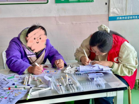 活动开始前,志愿者们已做好充分准备:他们将带来的丙烯彩笔与各色纸张整齐摆放,又以温和的笑容与耐心的问候,悄然拉近了与孩子们的距离。进入绘画创作环节,志愿者们俯身倾听孩子们的奇思妙想,手把手引导他们挑选色彩、勾勒线条,鼓励他们借画笔抒发内心世界。原本有些腼腆的孩子,也渐渐放松下来,在彩笔的挥洒间释放创意——一张张充满童真的画作在互动中诞生,每一笔色彩都承载着信任与喜悦。